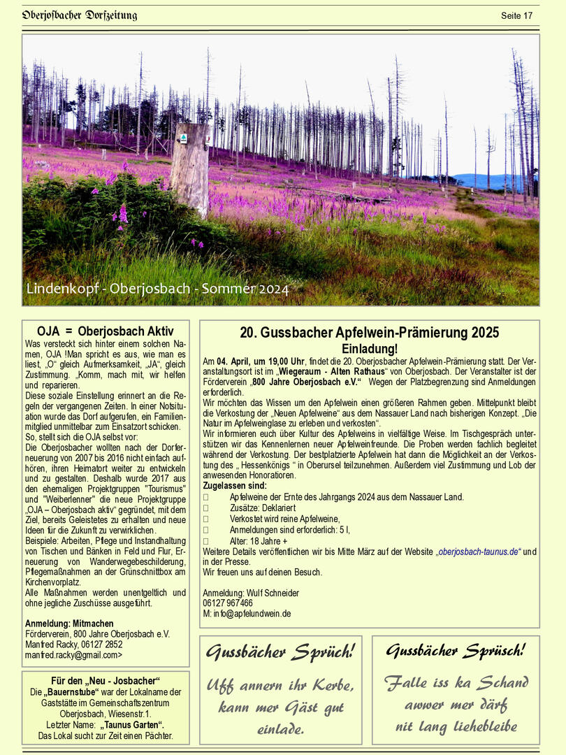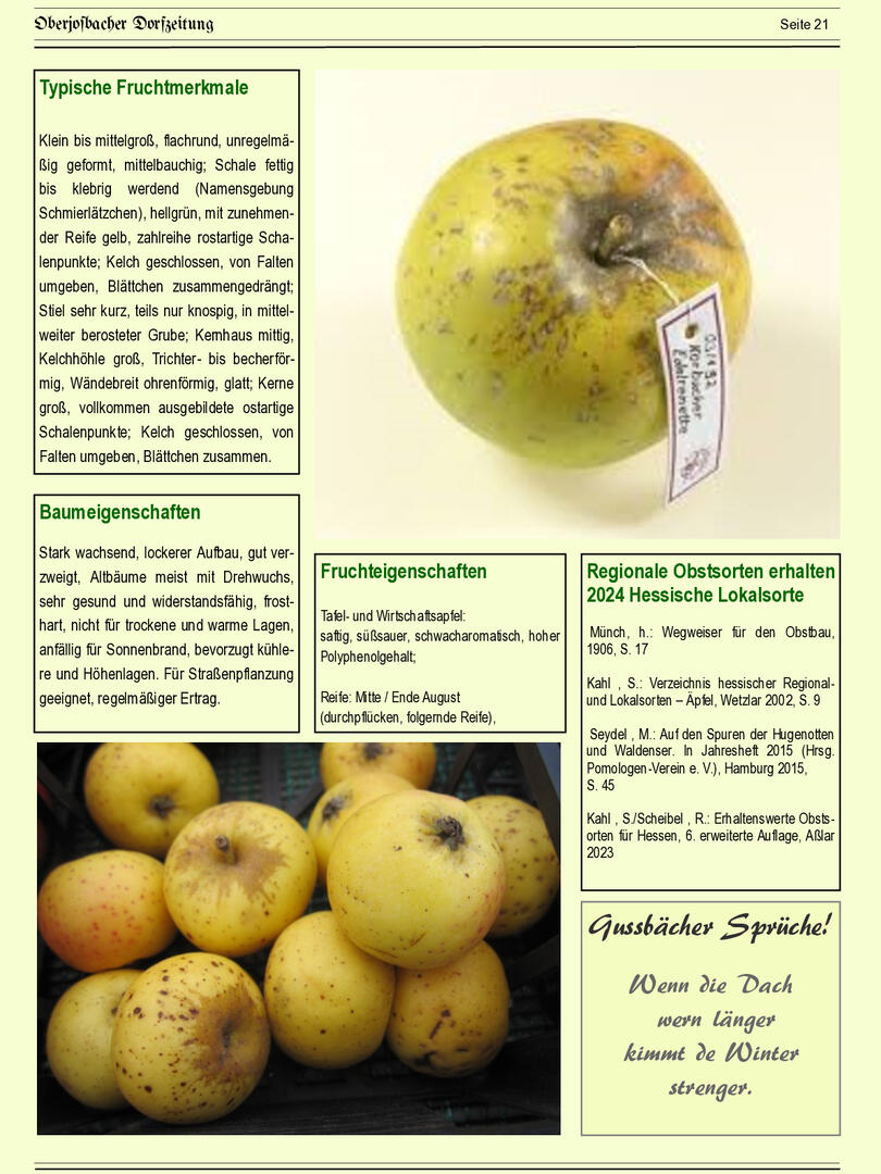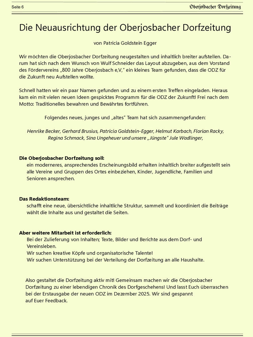 Bis Ende 2024 wurde die Redaktionsarbeit von Wulf Schneider koordiniert, der mit viel Engagement spannende Artikel zu Natur, Geschichte, Wetter, Apfelthemen und Kulinarik beigesteuert hat. Doch auch viele weitere Autorinnen und Autoren haben mit ihren Beiträgen die ODZ bereichert – ihnen allen ein herzliches Dankeschön!