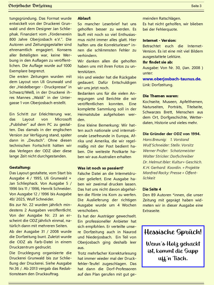 Weiter unten lassen sich bereits viele ältere Dorfzeitungs-Ausgaben als PDF herunterladen oder direkt lesen. Allerdings sind einige der frühen Ausgaben noch nicht digitalisiert – wer sich hier fachkundig einbringen möchte, ist herzlich willkommen!