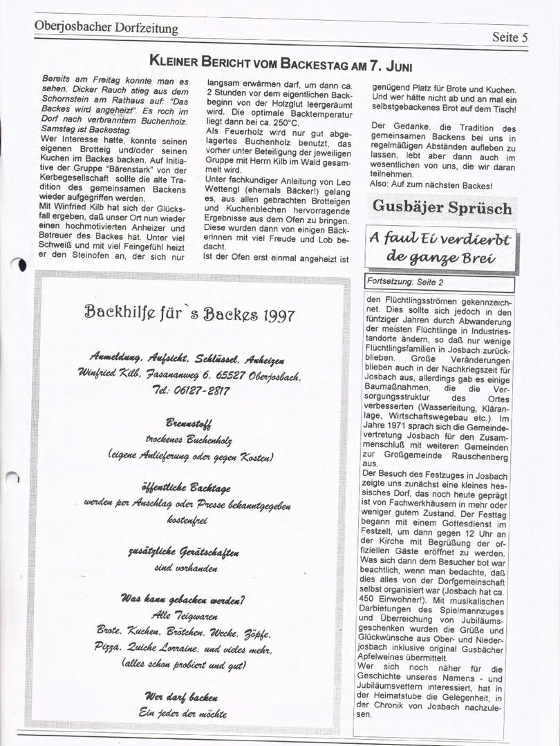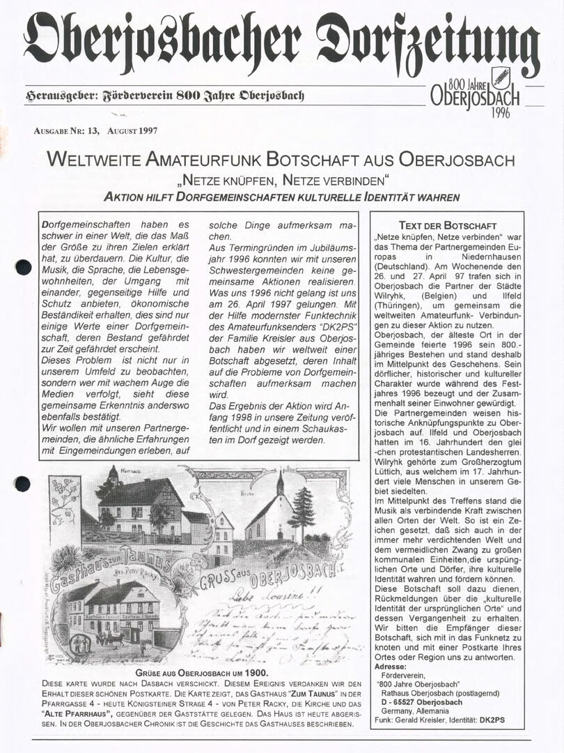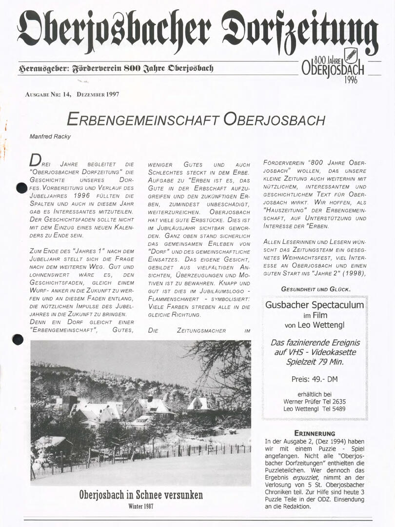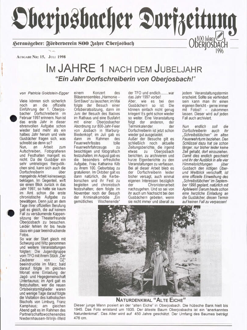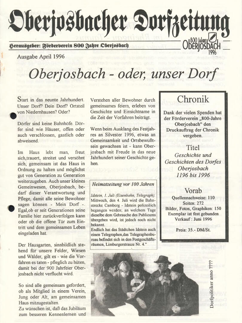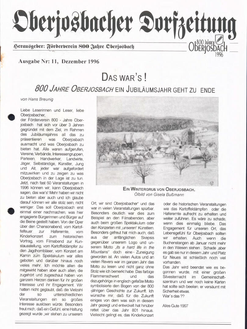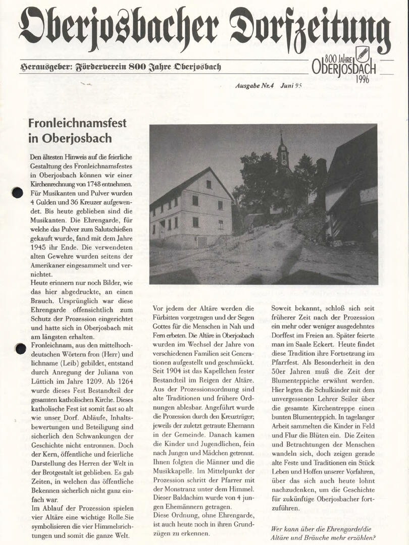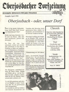 Im November 1994 erschien die erste Ausgabe der Oberjosbacher Dorfzeitung – ursprünglich, um die Oberjosbacher auf das bevorstehende 800-jährige Ortsjubiläum einzustimmen und zu motivieren. Anfangs wurde die Zeitschrift viermal im Jahr veröffentlicht. Doch aufgrund des hohen Arbeitsaufwands und der damals beträchtlichen Druckkosten musste die Erscheinungsfrequenz im Laufe der Jahre reduziert werden – zunächst auf zwei, später auf eine Ausgabe pro Jahr.