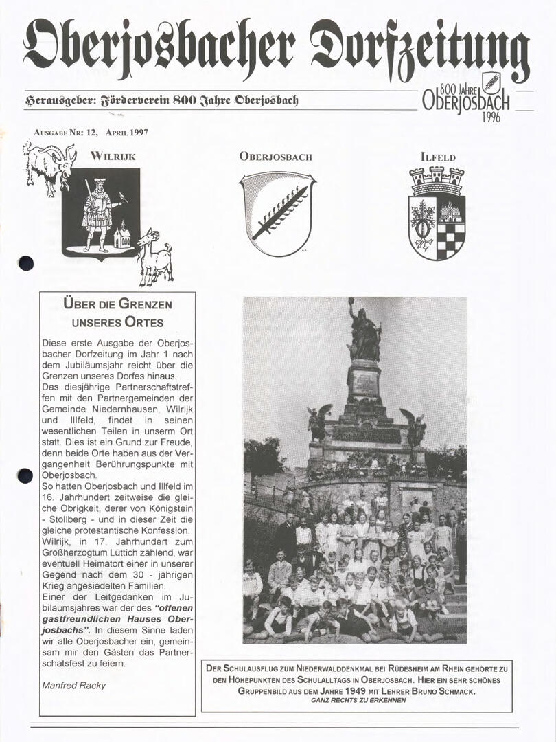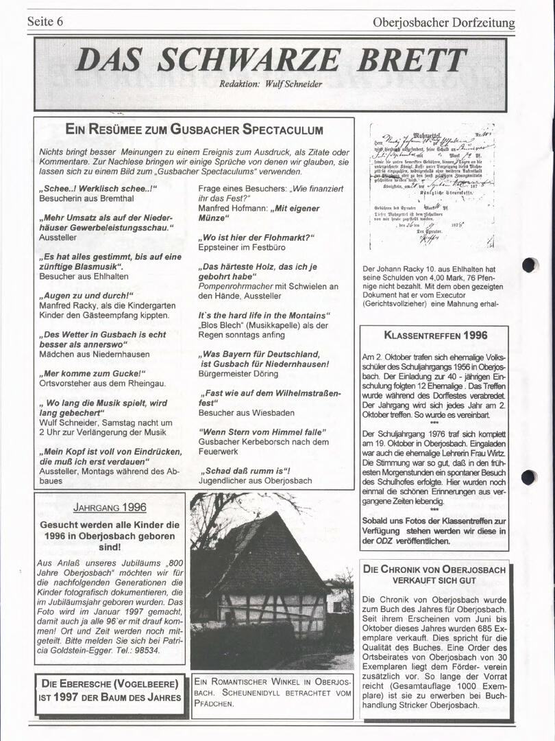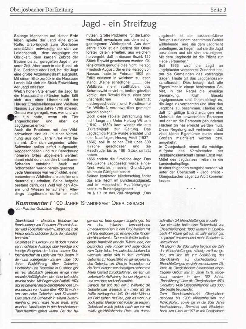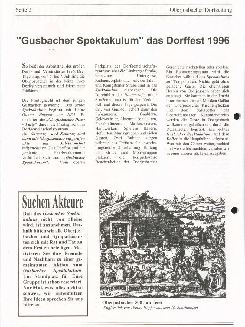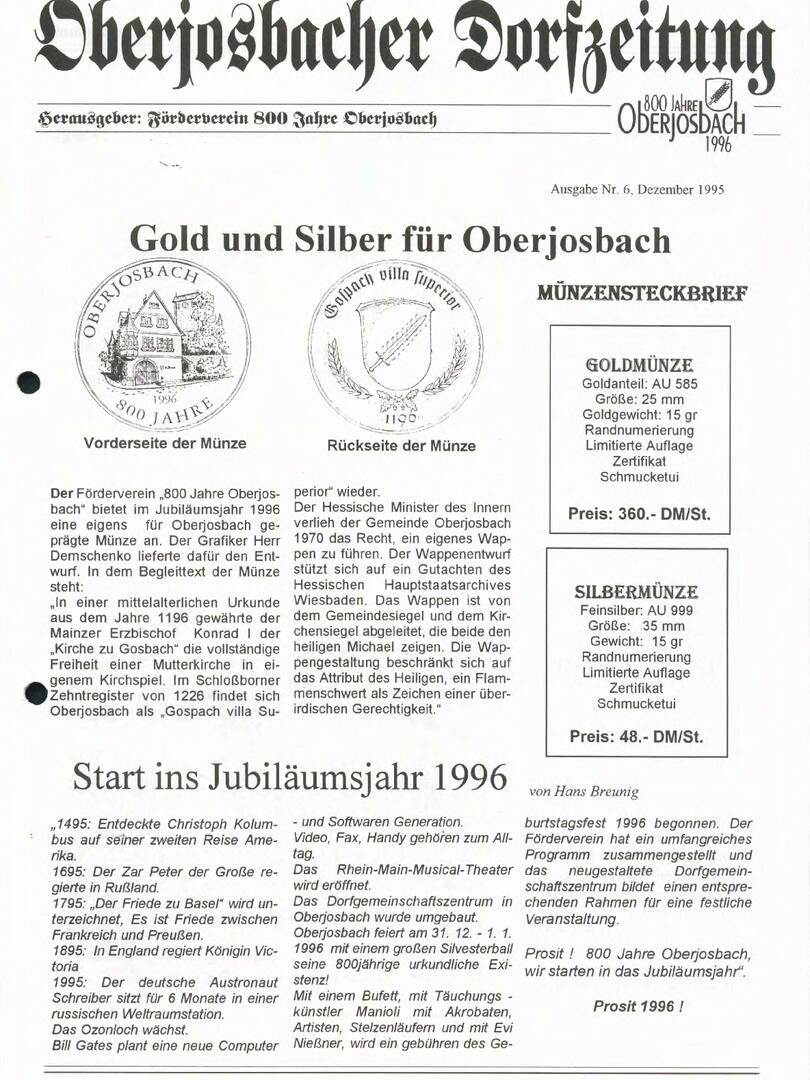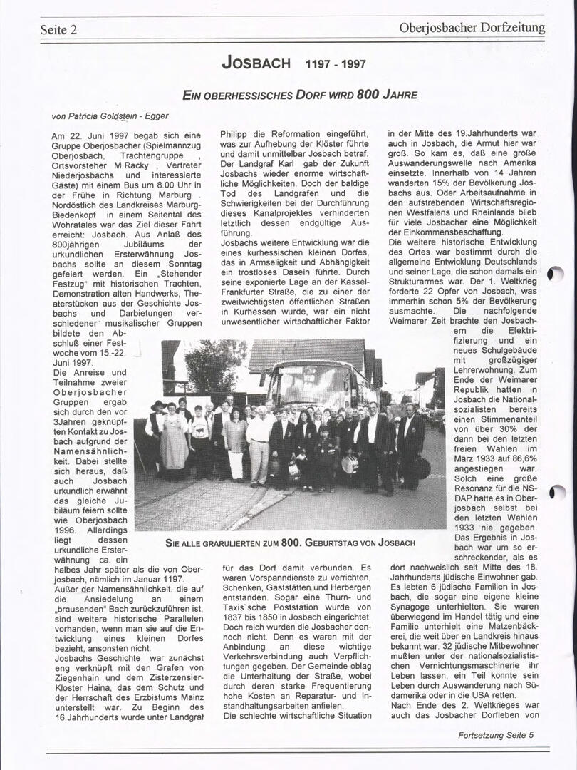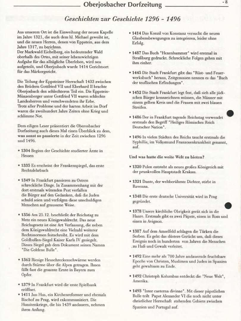 Im November 1994 erschien die erste Ausgabe der Oberjosbacher Dorfzeitung – ursprünglich, um die Oberjosbacher auf das bevorstehende 800-jährige Ortsjubiläum einzustimmen und zu motivieren. Anfangs wurde die Zeitschrift viermal im Jahr veröffentlicht. Doch aufgrund des hohen Arbeitsaufwands und der damals beträchtlichen Druckkosten musste die Erscheinungsfrequenz im Laufe der Jahre reduziert werden – zunächst auf zwei, später auf eine Ausgabe pro Jahr.