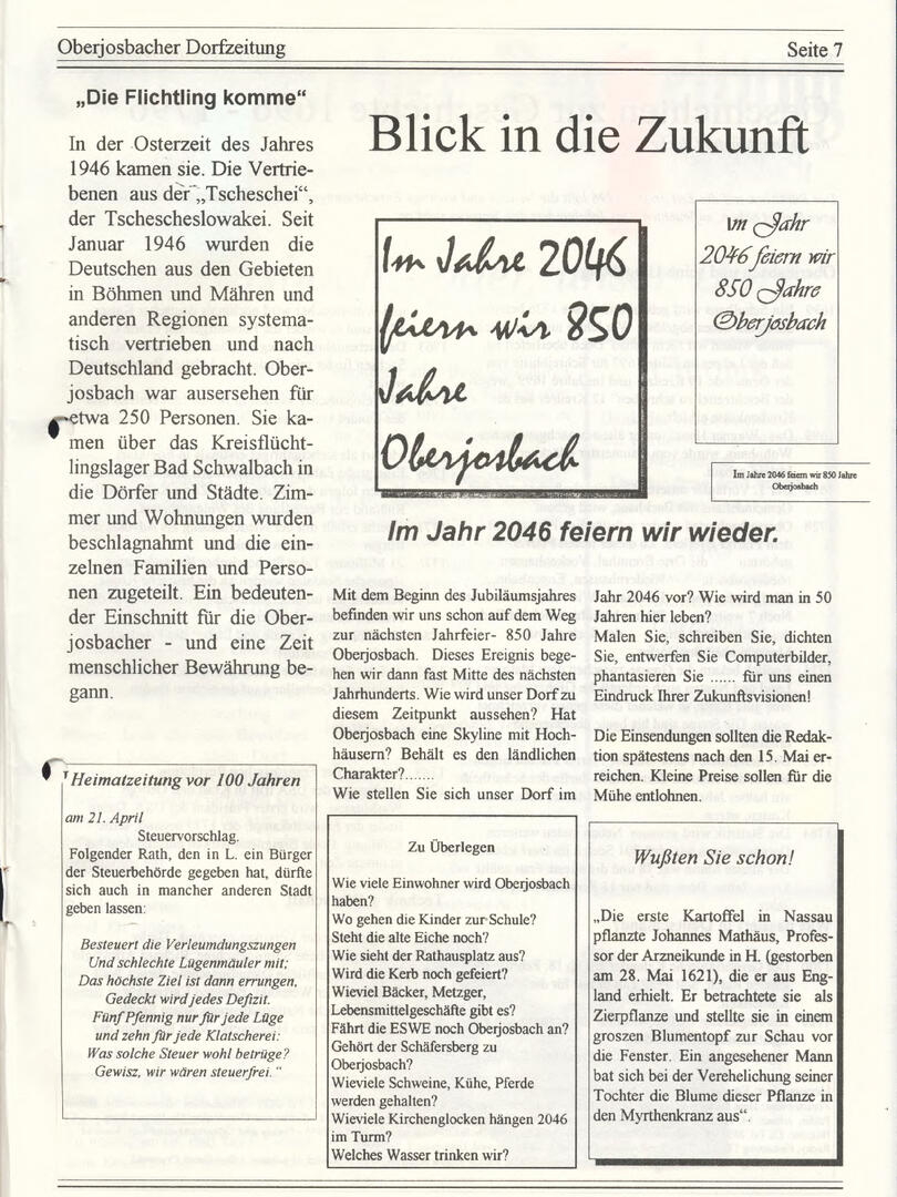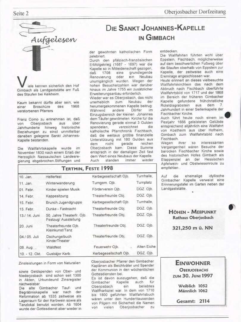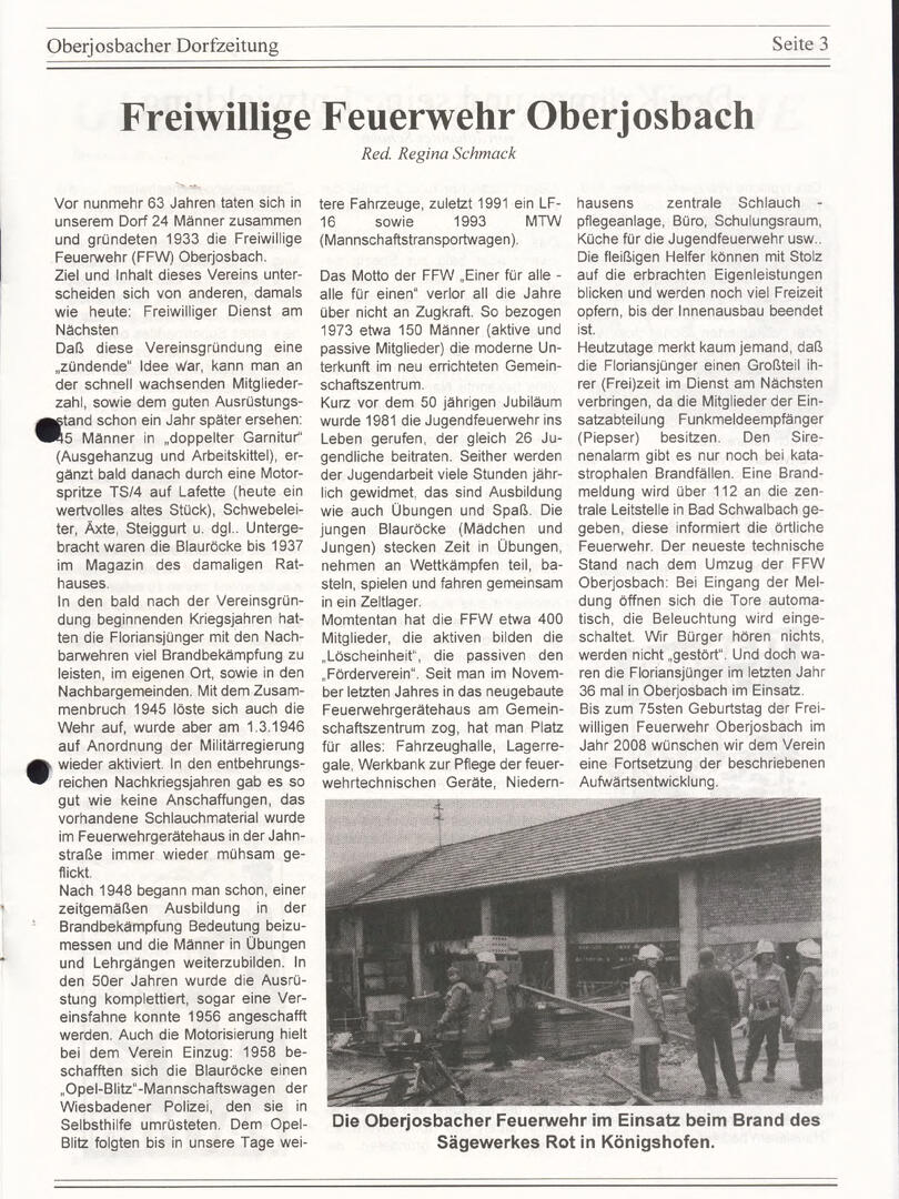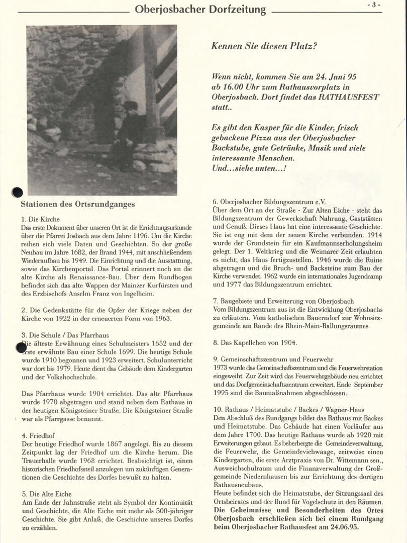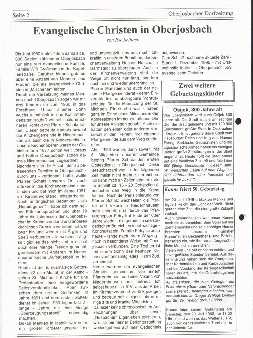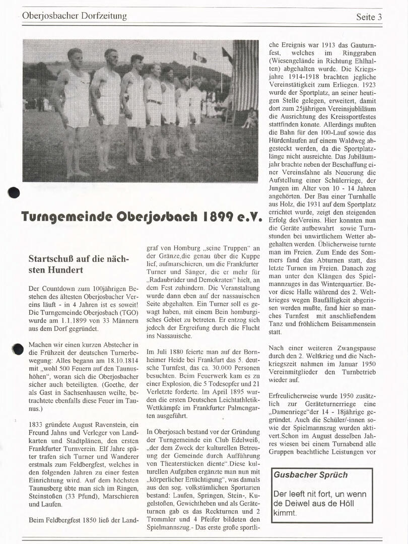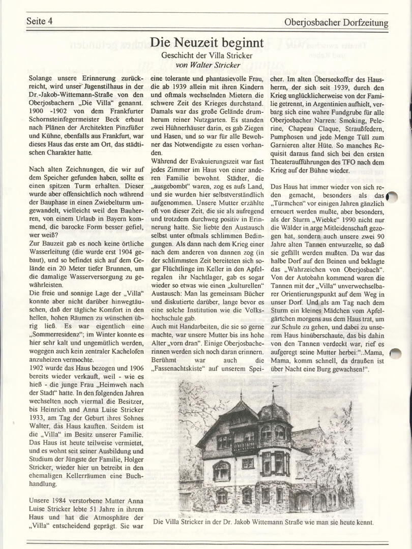Im November 1994 erschien die erste Ausgabe der Oberjosbacher Dorfzeitung – ursprünglich, um die Oberjosbacher auf das bevorstehende 800-jährige Ortsjubiläum einzustimmen und zu motivieren. Anfangs wurde die Zeitschrift viermal im Jahr veröffentlicht. Doch aufgrund des hohen Arbeitsaufwands und der damals beträchtlichen Druckkosten musste die Erscheinungsfrequenz im Laufe der Jahre reduziert werden – zunächst auf zwei, später auf eine Ausgabe pro Jahr.