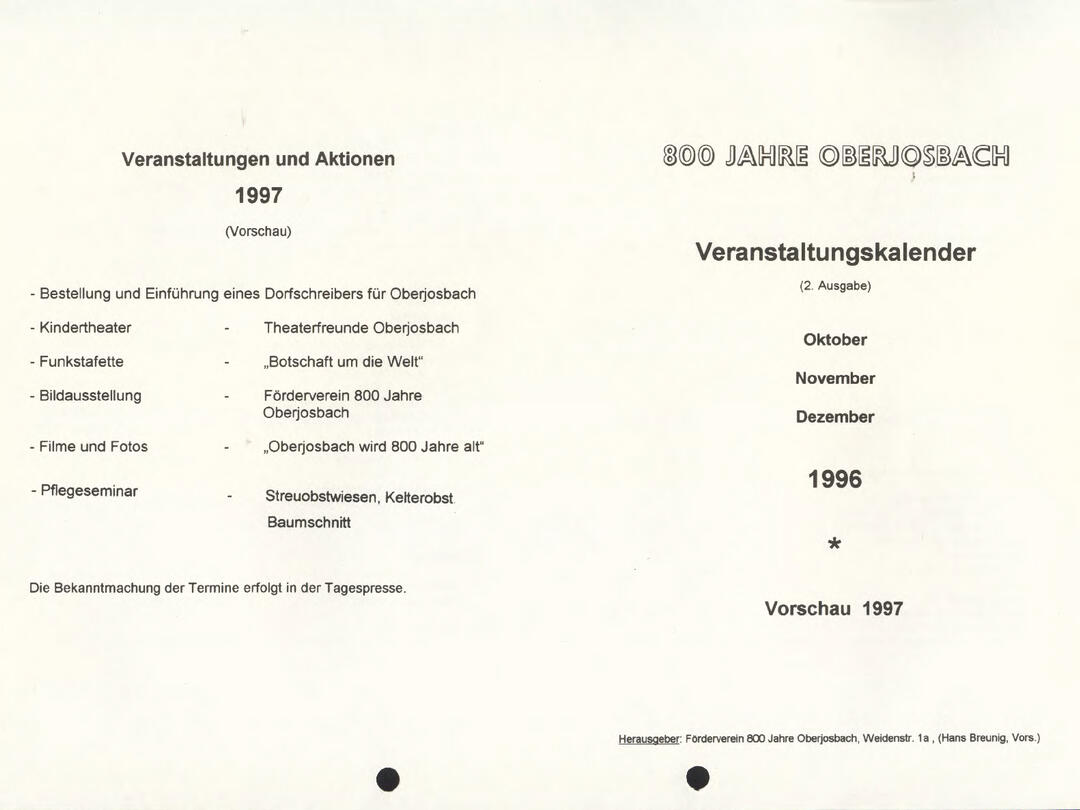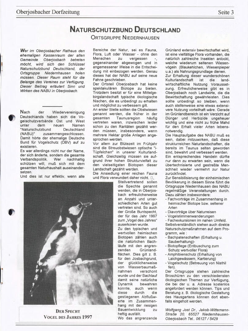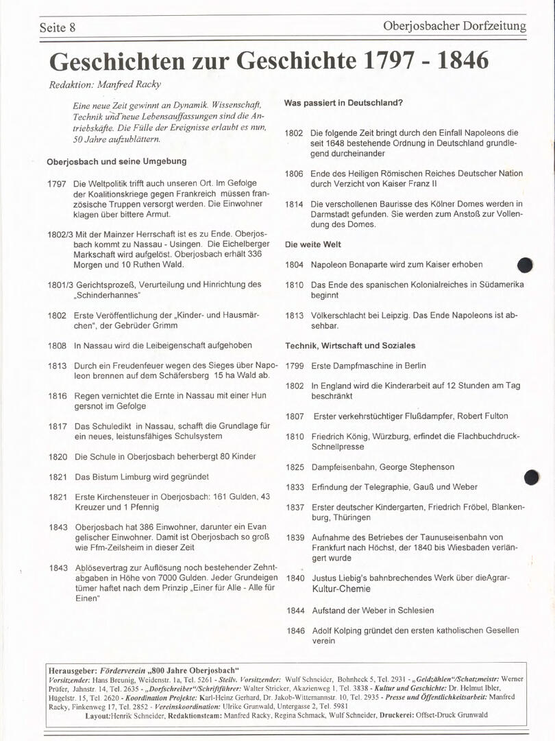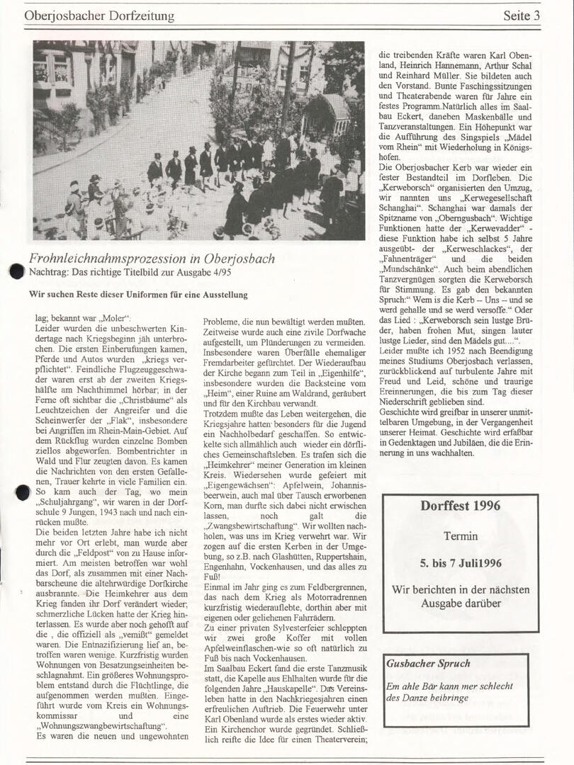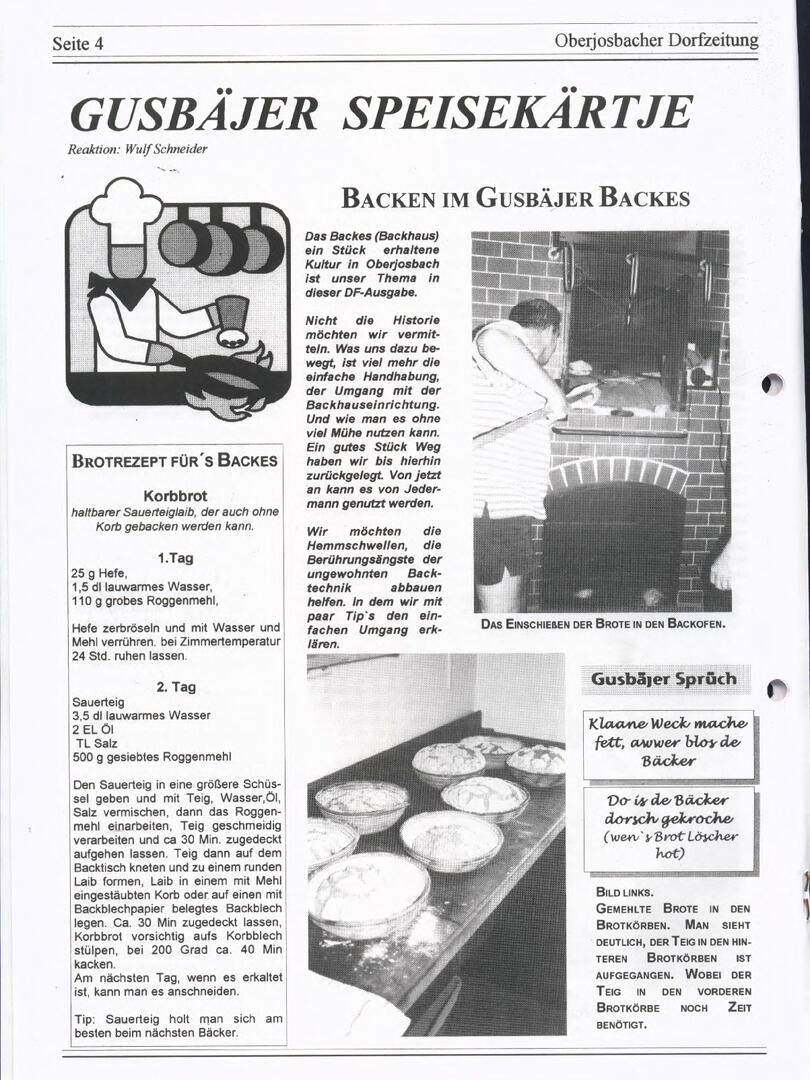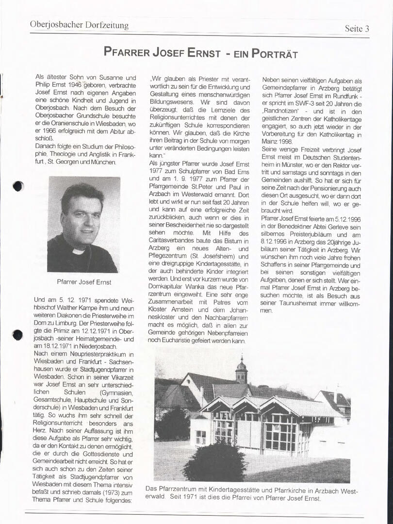 Im November 1994 erschien die erste Ausgabe der Oberjosbacher Dorfzeitung – ursprünglich, um die Oberjosbacher auf das bevorstehende 800-jährige Ortsjubiläum einzustimmen und zu motivieren. Anfangs wurde die Zeitschrift viermal im Jahr veröffentlicht. Doch aufgrund des hohen Arbeitsaufwands und der damals beträchtlichen Druckkosten musste die Erscheinungsfrequenz im Laufe der Jahre reduziert werden – zunächst auf zwei, später auf eine Ausgabe pro Jahr.