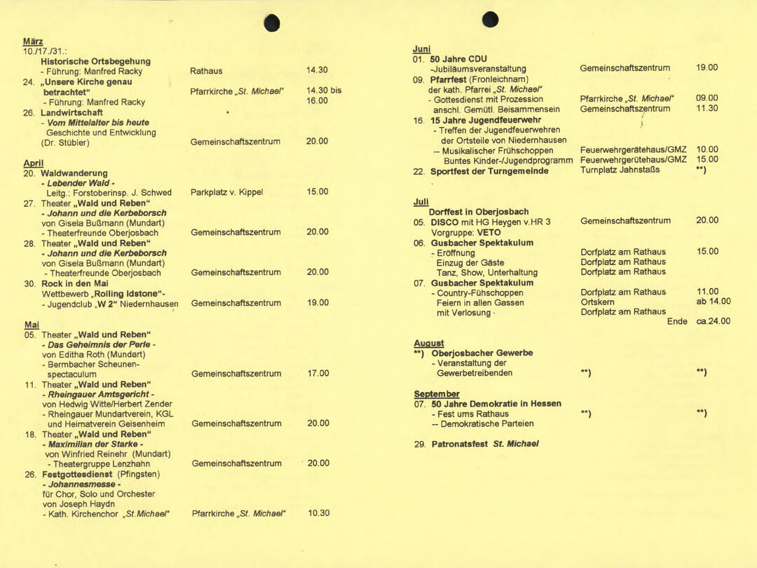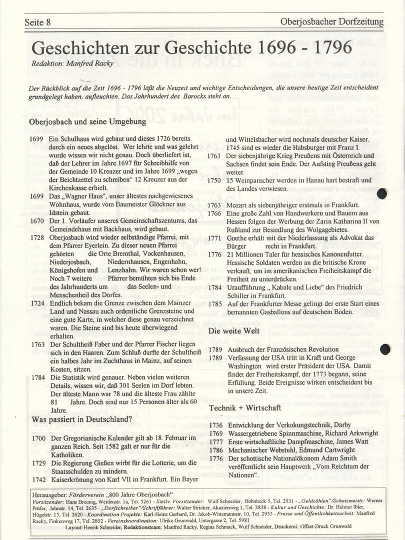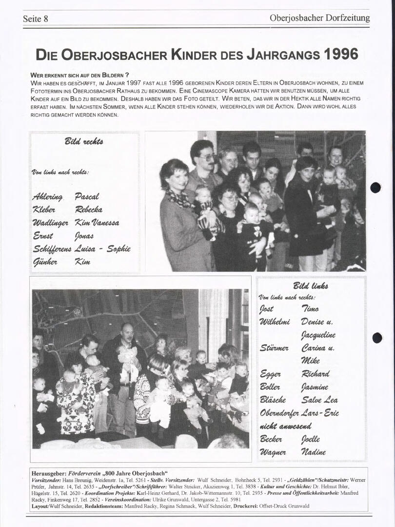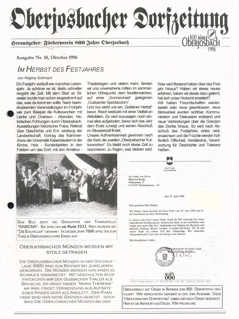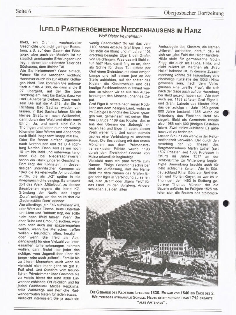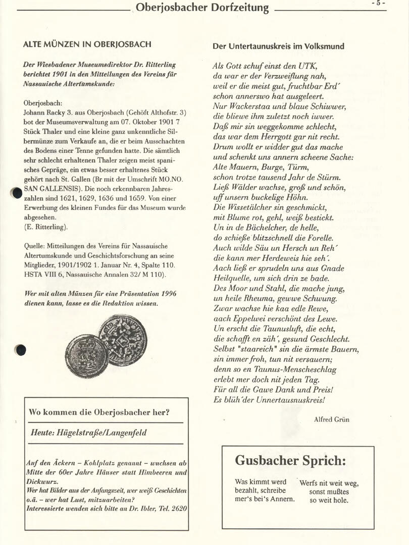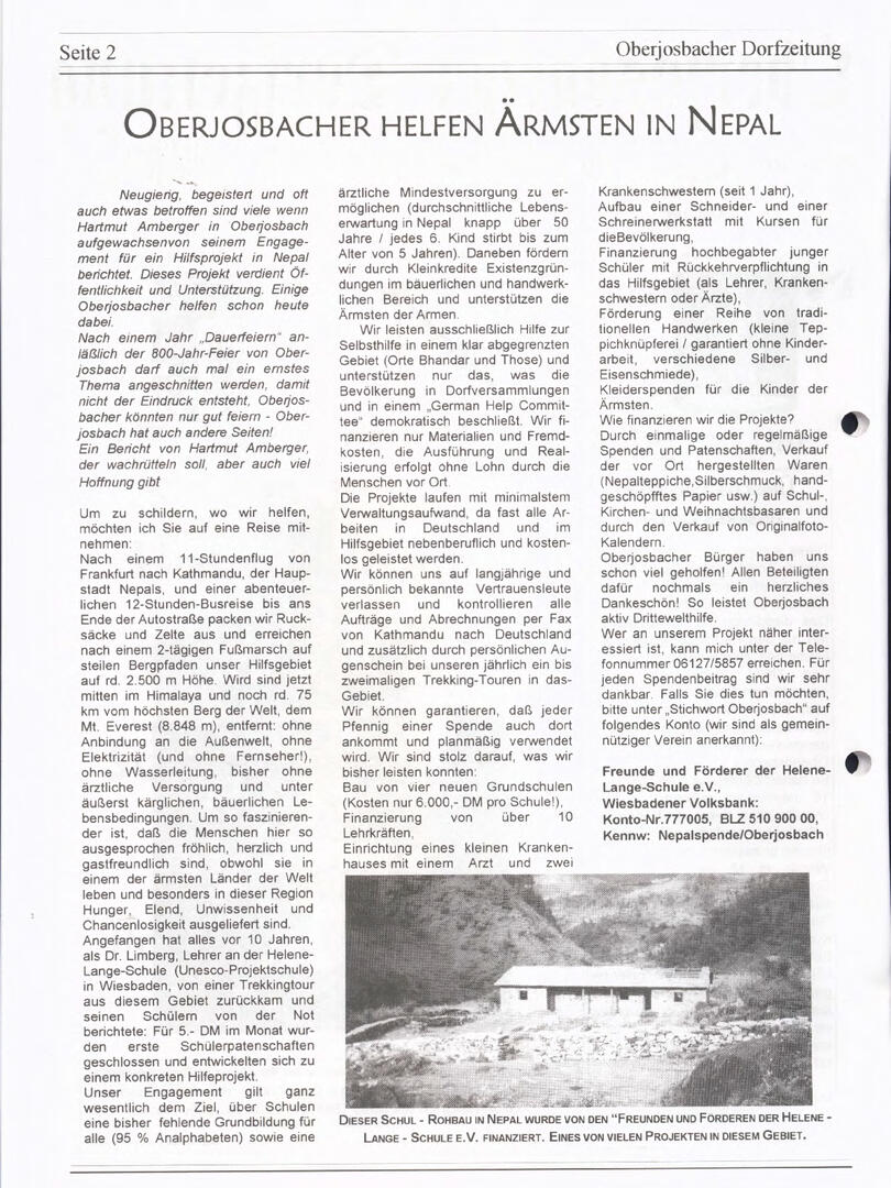 Im November 1994 erschien die erste Ausgabe der Oberjosbacher Dorfzeitung – ursprünglich, um die Oberjosbacher auf das bevorstehende 800-jährige Ortsjubiläum einzustimmen und zu motivieren. Anfangs wurde die Zeitschrift viermal im Jahr veröffentlicht. Doch aufgrund des hohen Arbeitsaufwands und der damals beträchtlichen Druckkosten musste die Erscheinungsfrequenz im Laufe der Jahre reduziert werden – zunächst auf zwei, später auf eine Ausgabe pro Jahr.