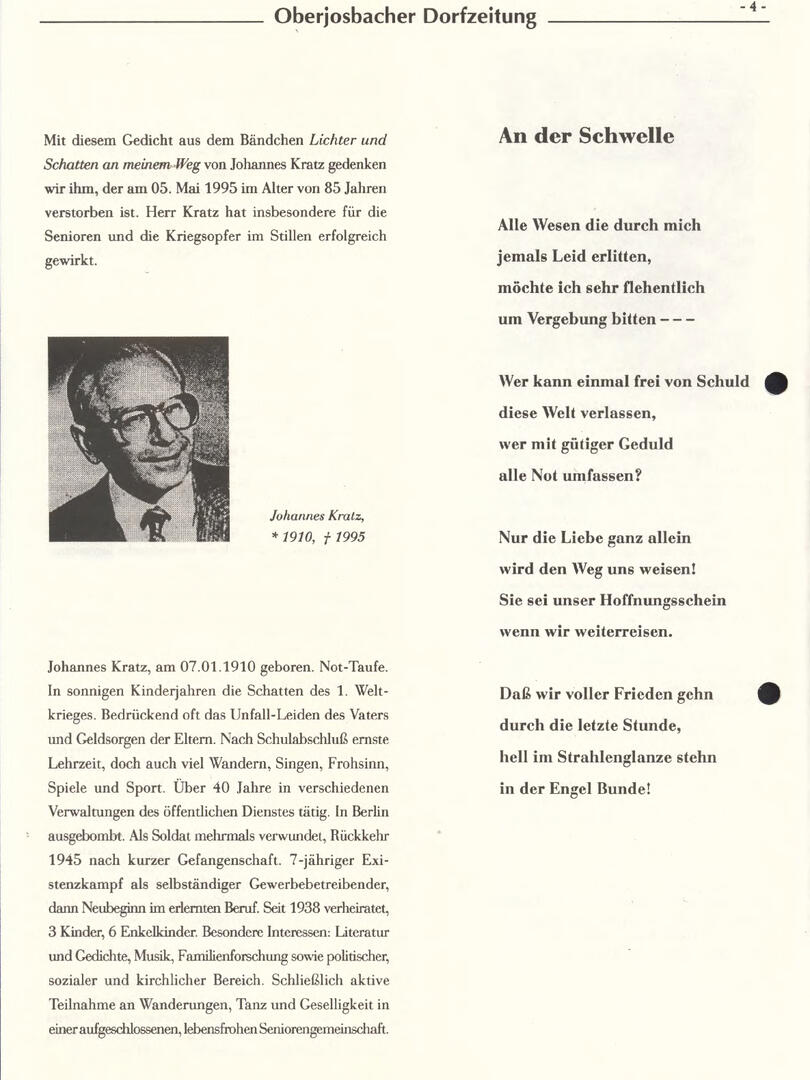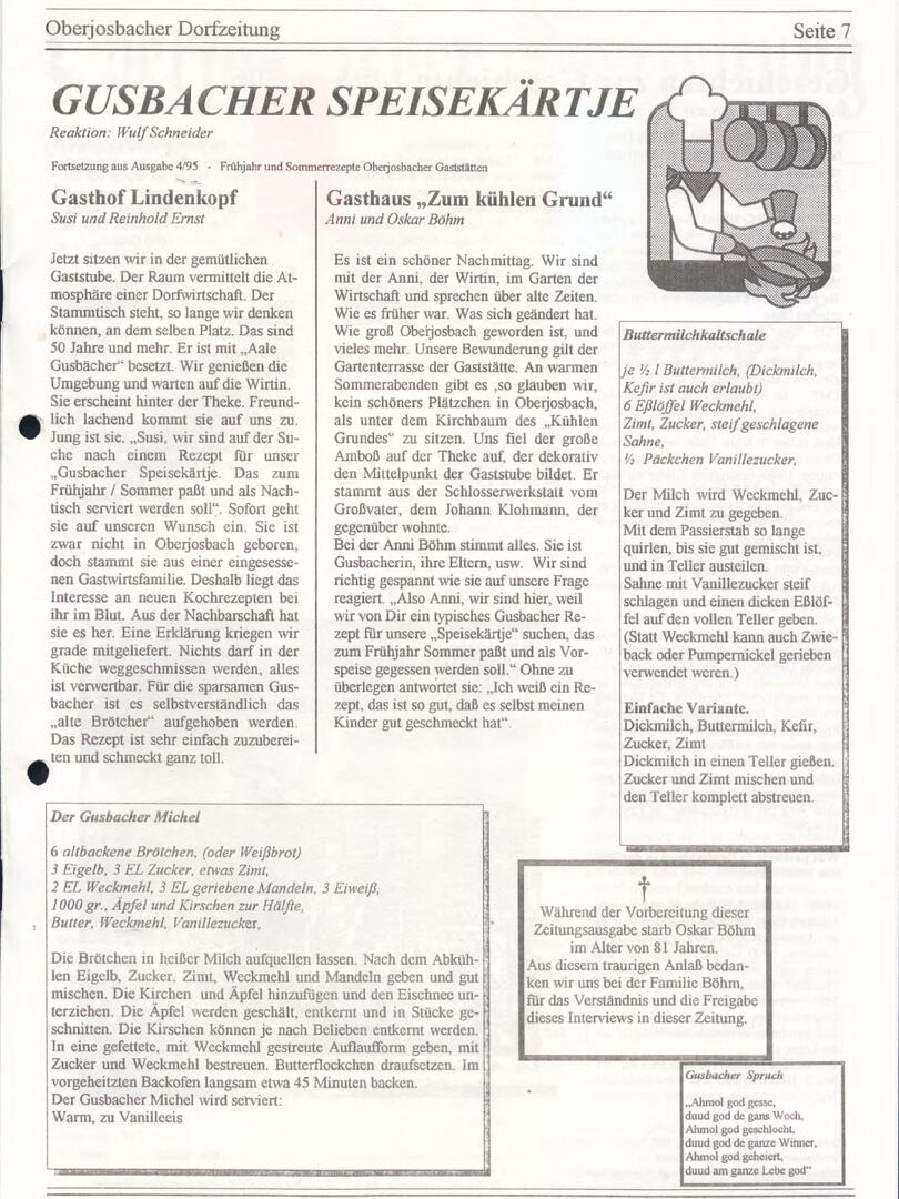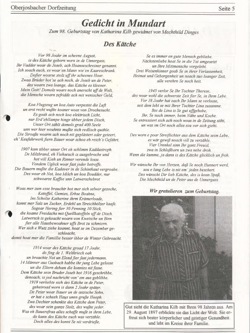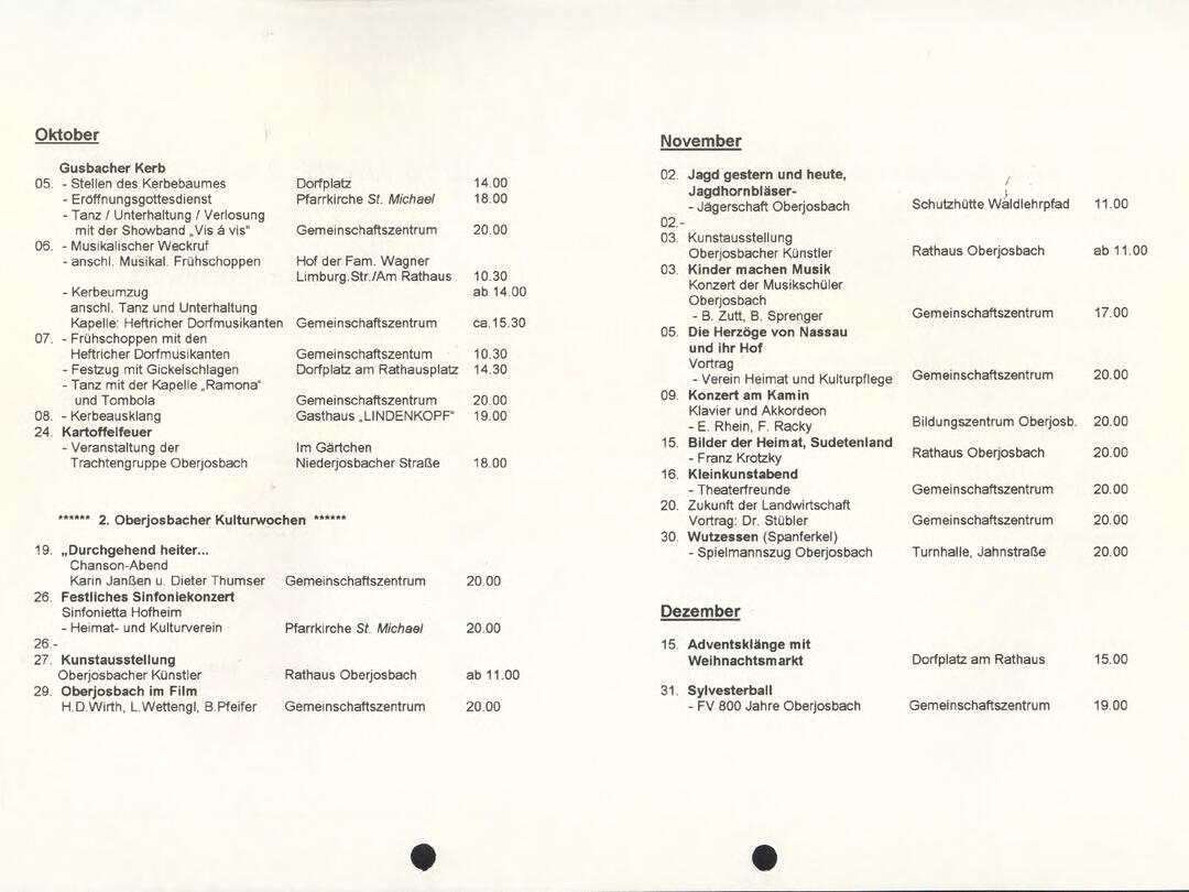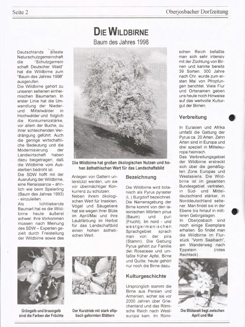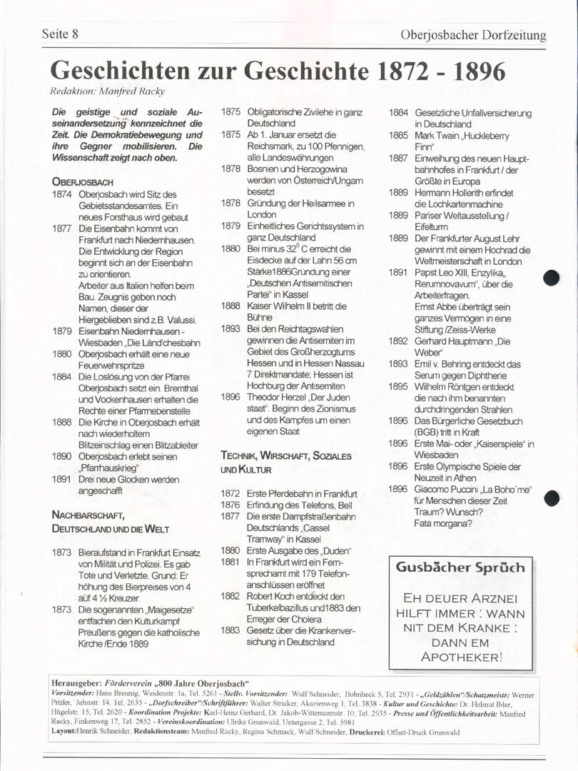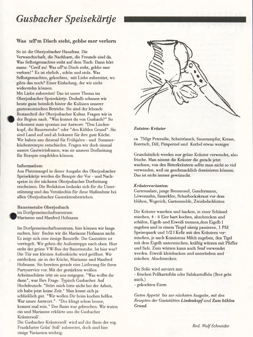 Im November 1994 erschien die erste Ausgabe der Oberjosbacher Dorfzeitung – ursprünglich, um die Oberjosbacher auf das bevorstehende 800-jährige Ortsjubiläum einzustimmen und zu motivieren. Anfangs wurde die Zeitschrift viermal im Jahr veröffentlicht. Doch aufgrund des hohen Arbeitsaufwands und der damals beträchtlichen Druckkosten musste die Erscheinungsfrequenz im Laufe der Jahre reduziert werden – zunächst auf zwei, später auf eine Ausgabe pro Jahr.