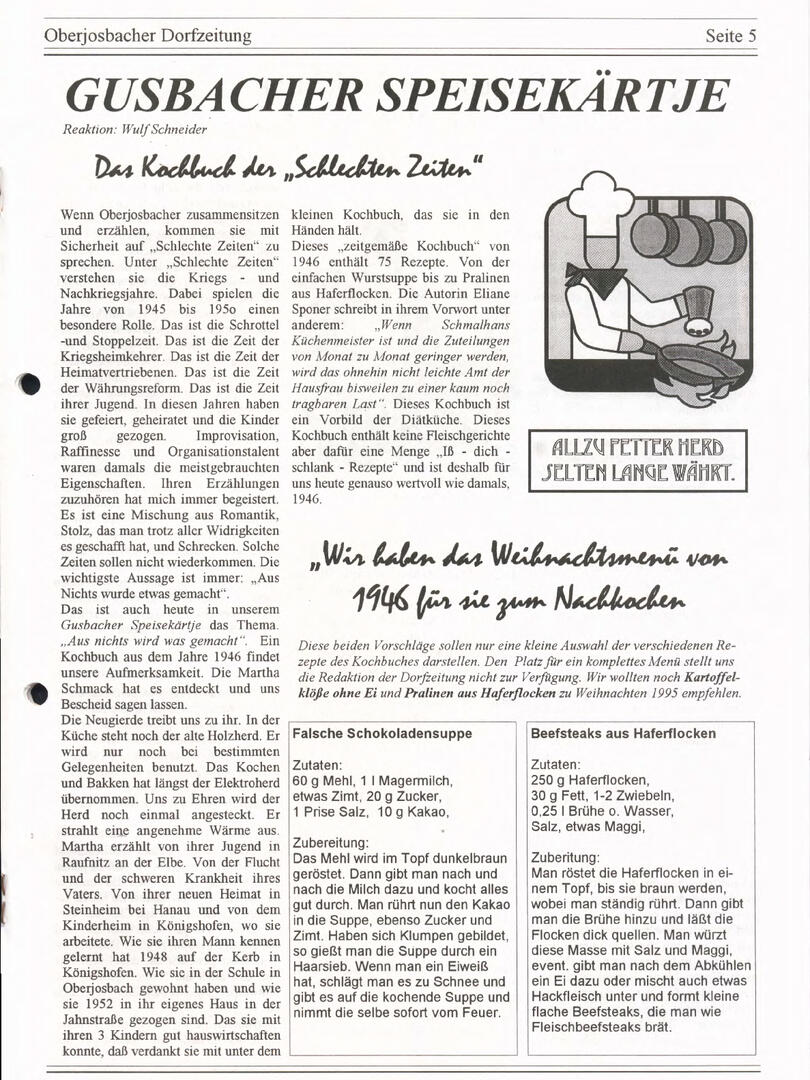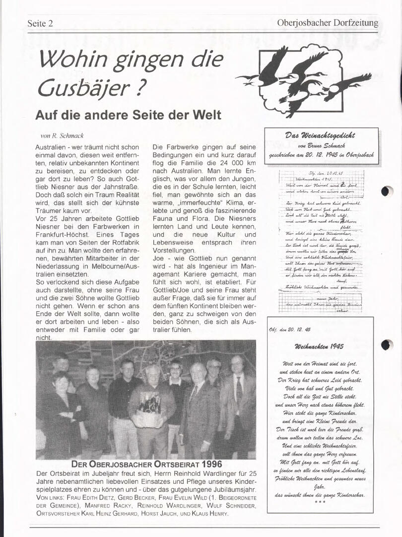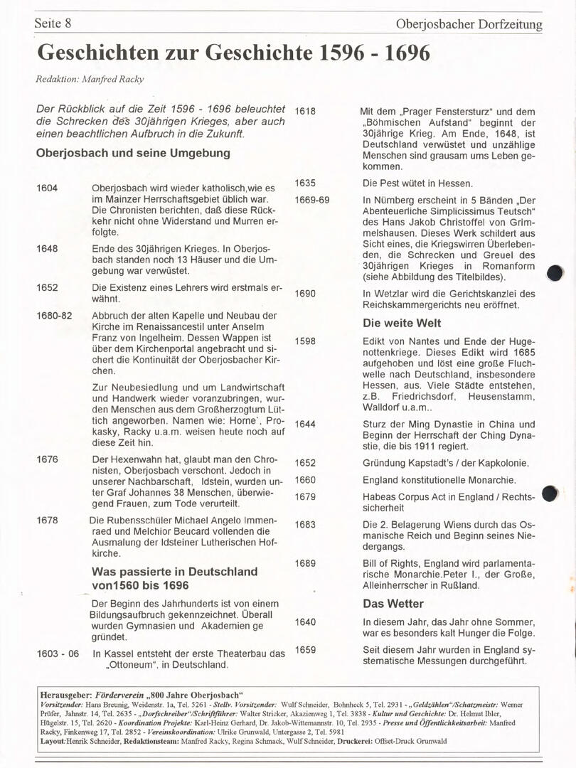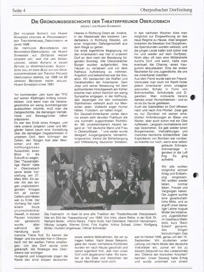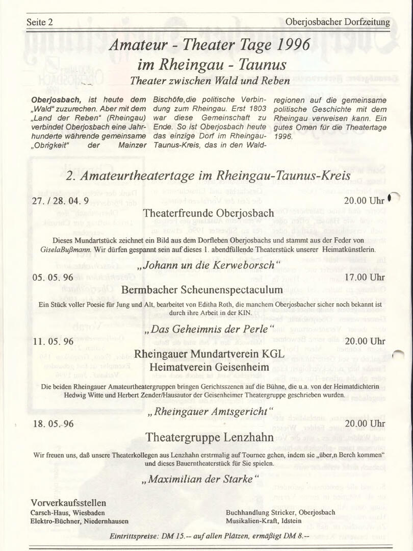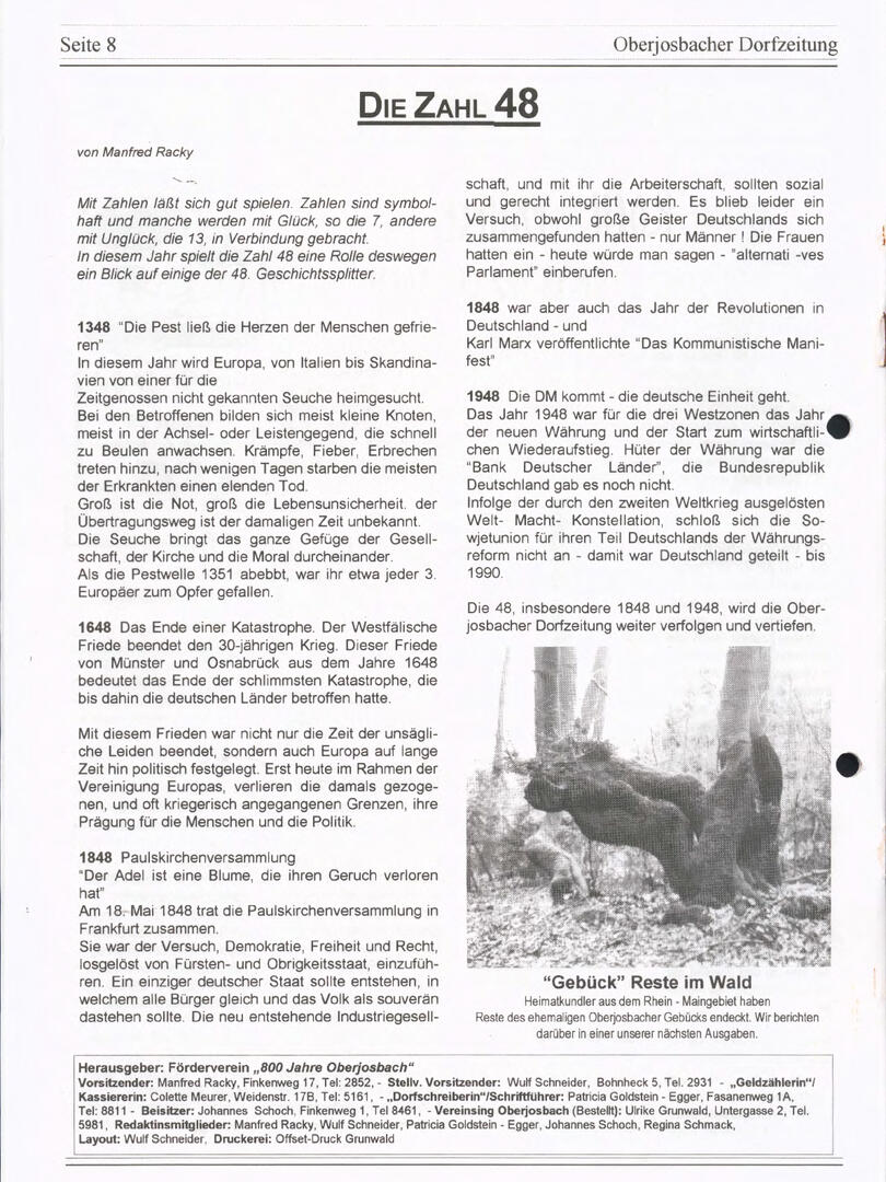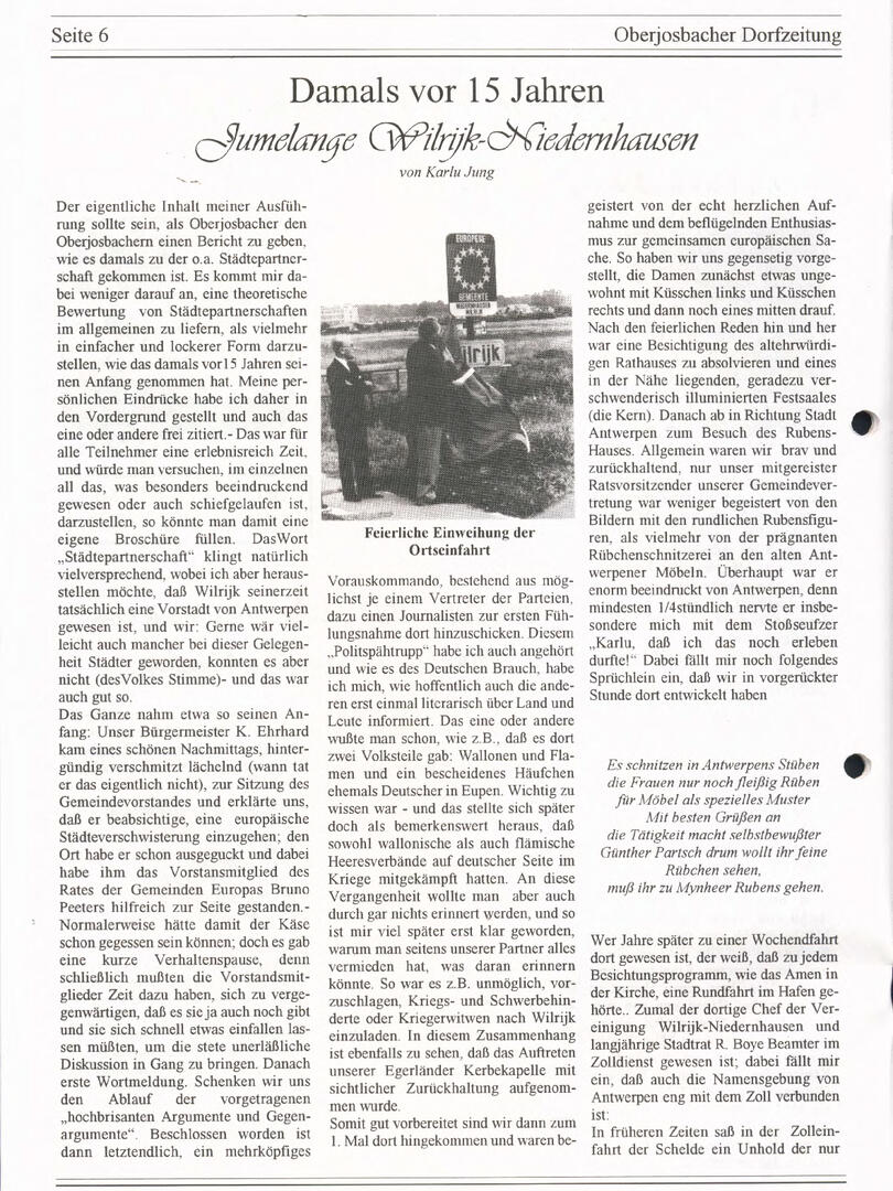 Im November 1994 erschien die erste Ausgabe der Oberjosbacher Dorfzeitung – ursprünglich, um die Oberjosbacher auf das bevorstehende 800-jährige Ortsjubiläum einzustimmen und zu motivieren. Anfangs wurde die Zeitschrift viermal im Jahr veröffentlicht. Doch aufgrund des hohen Arbeitsaufwands und der damals beträchtlichen Druckkosten musste die Erscheinungsfrequenz im Laufe der Jahre reduziert werden – zunächst auf zwei, später auf eine Ausgabe pro Jahr.