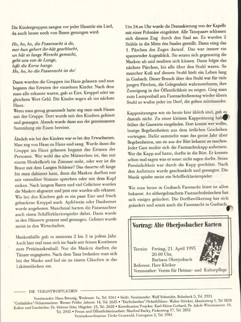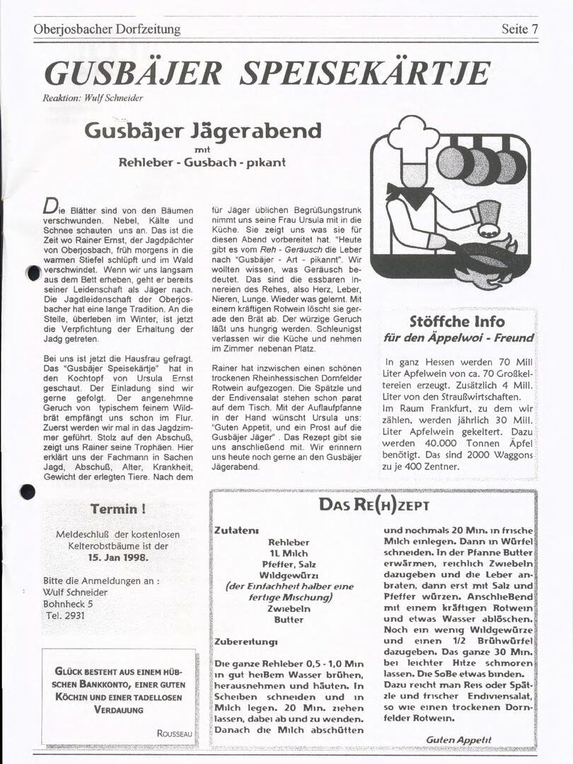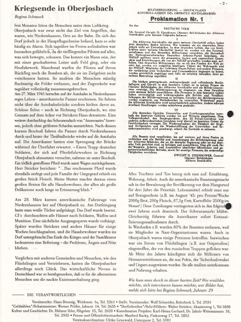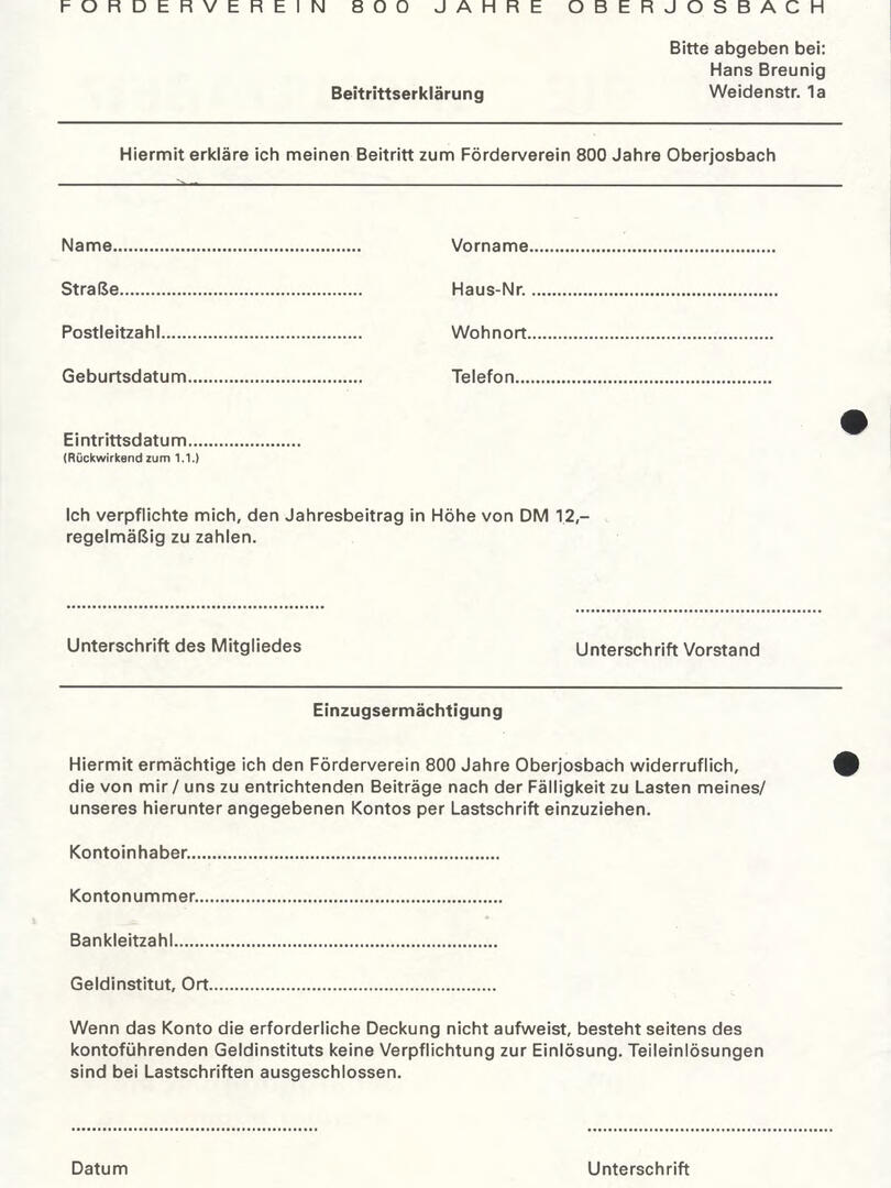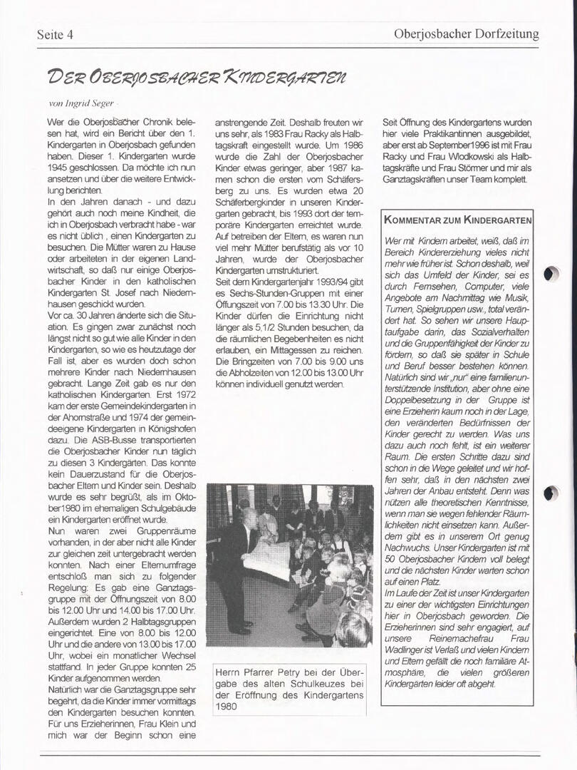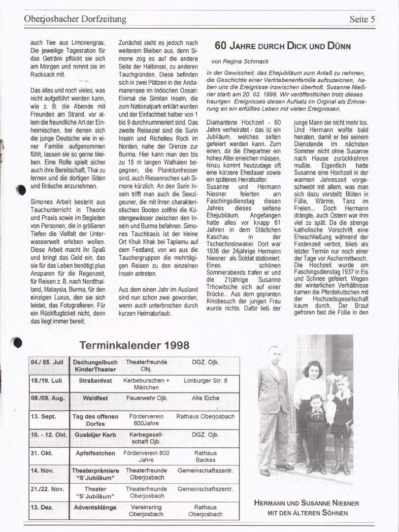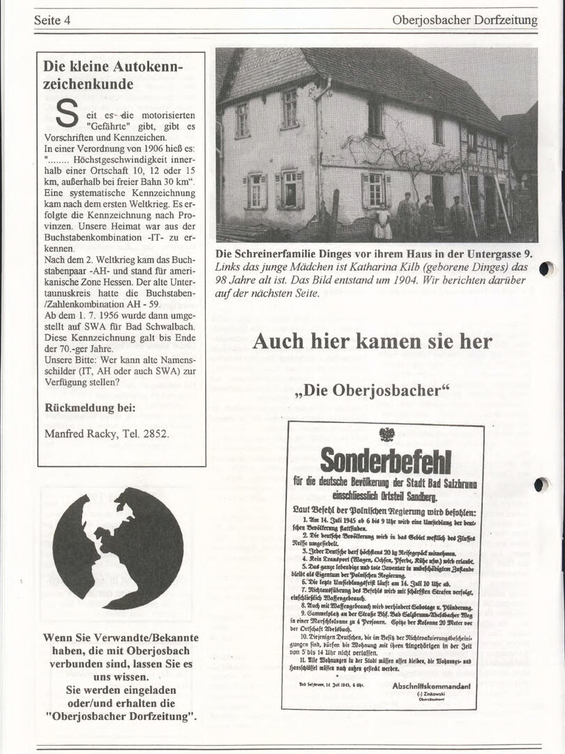 Im November 1994 erschien die erste Ausgabe der Oberjosbacher Dorfzeitung – ursprünglich, um die Oberjosbacher auf das bevorstehende 800-jährige Ortsjubiläum einzustimmen und zu motivieren. Anfangs wurde die Zeitschrift viermal im Jahr veröffentlicht. Doch aufgrund des hohen Arbeitsaufwands und der damals beträchtlichen Druckkosten musste die Erscheinungsfrequenz im Laufe der Jahre reduziert werden – zunächst auf zwei, später auf eine Ausgabe pro Jahr.