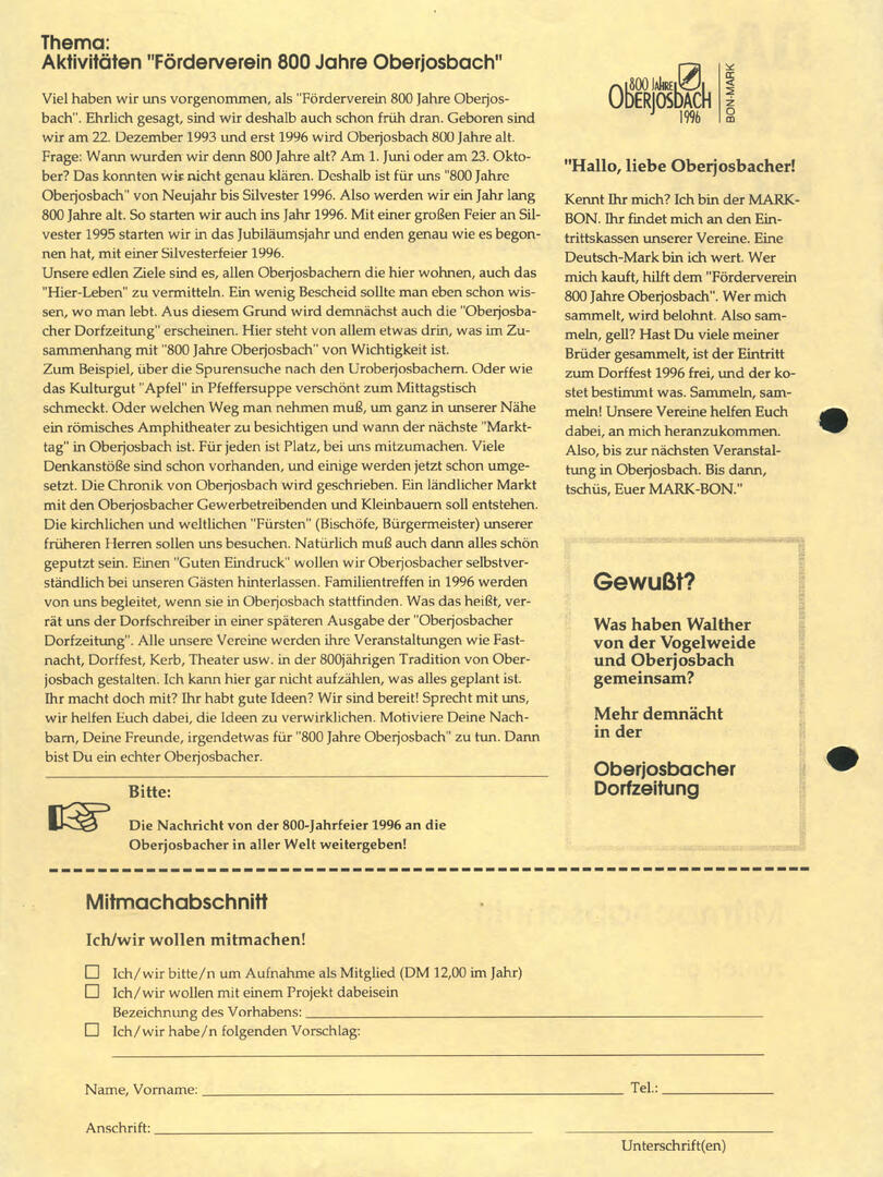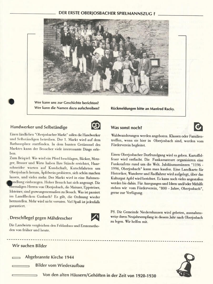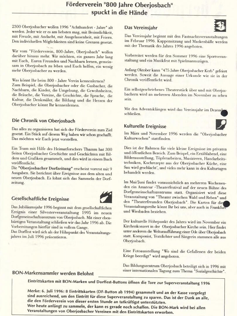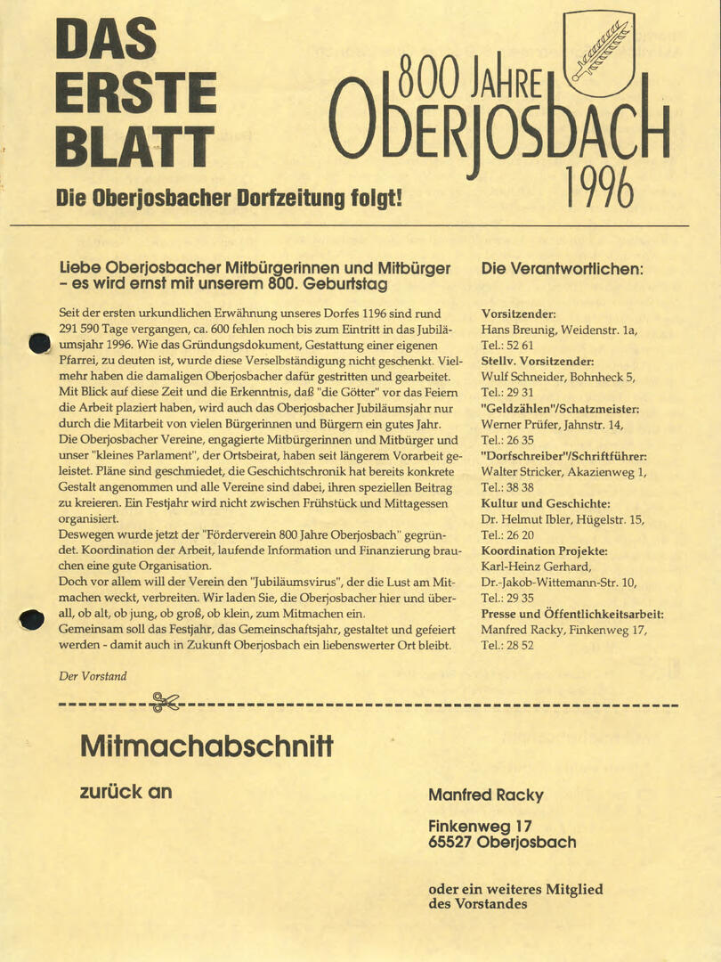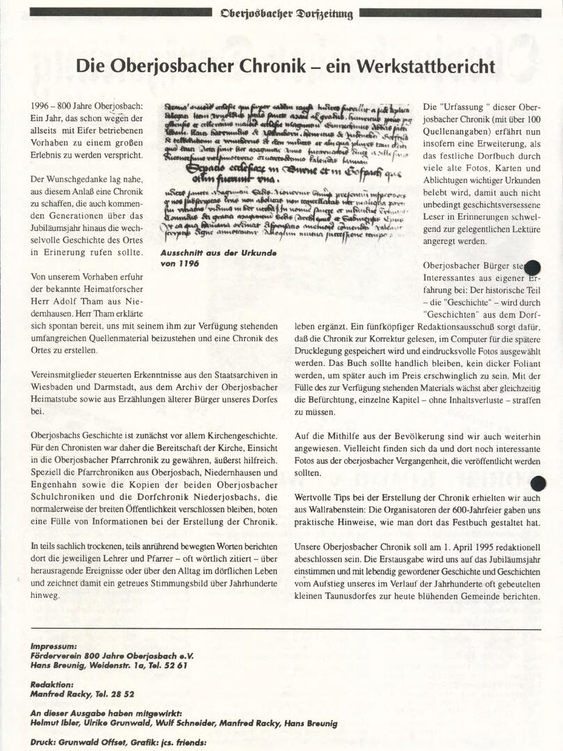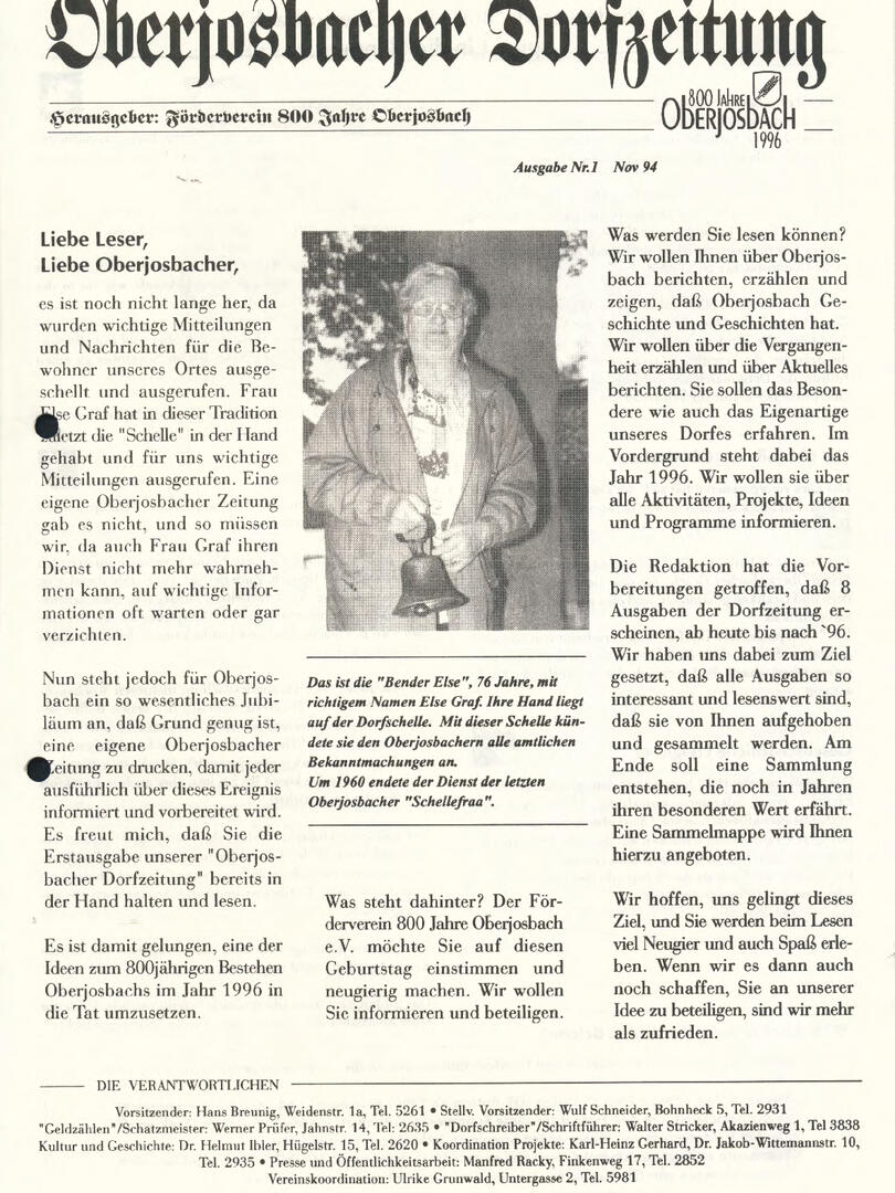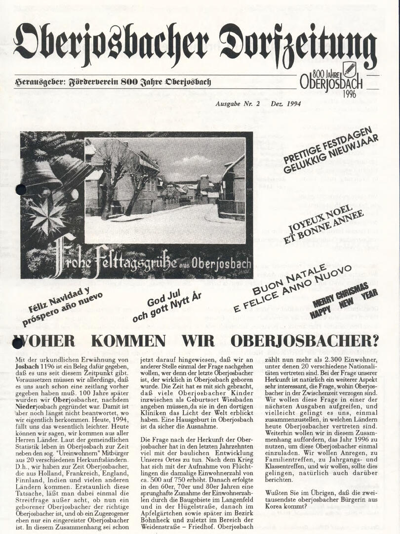 Im November 1994 erschien die erste Ausgabe der Oberjosbacher Dorfzeitung – ursprünglich, um die Oberjosbacher auf das bevorstehende 800-jährige Ortsjubiläum einzustimmen und zu motivieren. Anfangs wurde die Zeitschrift viermal im Jahr veröffentlicht. Doch aufgrund des hohen Arbeitsaufwands und der damals beträchtlichen Druckkosten musste die Erscheinungsfrequenz im Laufe der Jahre reduziert werden – zunächst auf zwei, später auf eine Ausgabe pro Jahr.